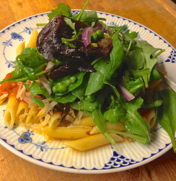 First, the onions must gently simmer in the oil until they’re soft and sweet. That’s what takes most of the time (not simmering the tomatoes). Once the ingredients are combined and heated through, we puree the sauce until it’s almost smooth so that it will coat the pasta delicately and evenly. This easy sauce is the best reason to add a good quality electric immersion blender to your kitchen. It pays for itself in no time.