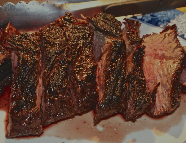 The hanger steak is a hefty, beefy, full of flavor-and-value cut. Maybe not the most attractive cut, especially for the filetophiles, the hanger features a membrane that separates the two “halves” that you have to work around. It’s not a big deal or a detracting factor. Often a restaurant will cut the steak in long halves eliminating the membrane. You can do that if you like; I prefer to grill them whole. Butchers have been taking the unpopular hangers home forever. Now you can find hanger at Whole Foods and their hanger cuts are very good. If you’ve have a “bistro steak” or the “onglet,” you’ve had hanger. Don’t pass on hanger because of its unusual shape or the membrane. It is truly delicious and more than a steak. It’s really a steak roast.