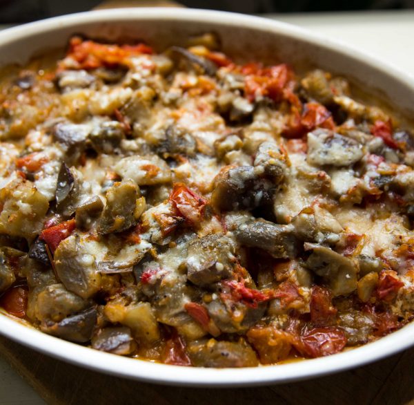 Now add one good cheese, maybe two, not the Domino’s five. Shred a nice chunk of Parmesan and sprinkle on top near the end of baking. Add an optional second cheese like fresh mozzarella that melts nicely in this dish.