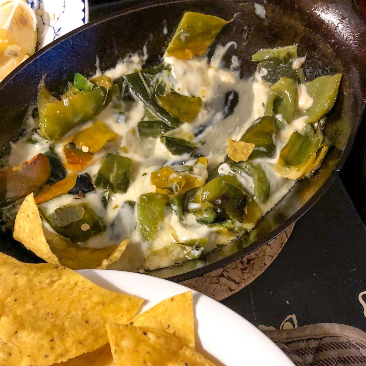 Even better, the simplest ideas are the best so just add cheese! Chop the roasted poblanos and toss into a greased iron skillet or oven proof dish. Add shredded melting cheese–Mexican melting cheese, or whatever you like, cheddar, longhorn, Jack. Add some more poblanos on top and put it all in the oven at 350 F until nice and melted. It won’t take long so hang around the oven or set the time for 15 minutes. Don’t scrimp o the chips, get some nice ones that can hold up to scooping the cheese. An iron skillet or Le Creuset works great because it will hold the heat and keep the cheese softer longer. In warm weather, why not just heat the cheese mix outdoors on the grill or fire pit. It’s a home-run appetizer with cold beer on the patio or snacking while you’re sofa sporting.