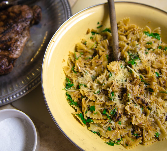 Roasted Cauliflower Pasta, while wonderfully delicious, also forever ends panic with vegetarian friends come for dinner. Omnivores have meat-centered dishes galore–braised short ribs when it’s cold, steaks, chops, and loins on the grill, plus burgers and sausages. Then there’s crock pots of pulled pork shoulder and chicken, and then smoky oven brisket. And salmon. Roast chicken and turkey. A dinner plan for fellow meat eaters is never a job.