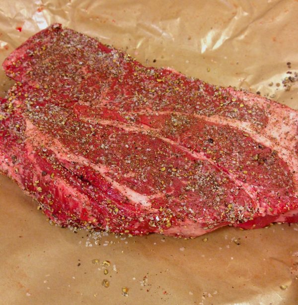 As far as prep goes, I go with the Louis Meuller/Texas style seasoning—a blend of Kosher salt and lots of coarse ground pepper (roughly 1/3rd Kosher salt to 2/3rds pepper). Spread it generously on all sides of the cut right before you put the meat in the smoker.